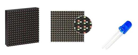 Cada píxel LED en la superficie de un módulo LED DIP se compone de tres LED: un LED rojo, un LED verde y un LED azul. El LED RGB sirve como base para cualquier pantalla LED a color. Debido a que los tres colores primarios (rojo, verde y azul) son los colores primarios en la rueda de colores, tienen el potencial de producir todos los colores posibles, incluido el blanco.