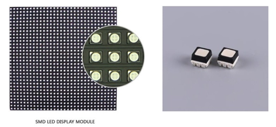 Los tres chips LED (LED rojo, LED verde y LED azul) en un módulo de pantalla LED SMD (dispositivo montado en superficie) se reagrupan en un solo punto. Los pines o patas LED largas ahora se han eliminado y los chips LED ahora están montados directamente en una sola unión.