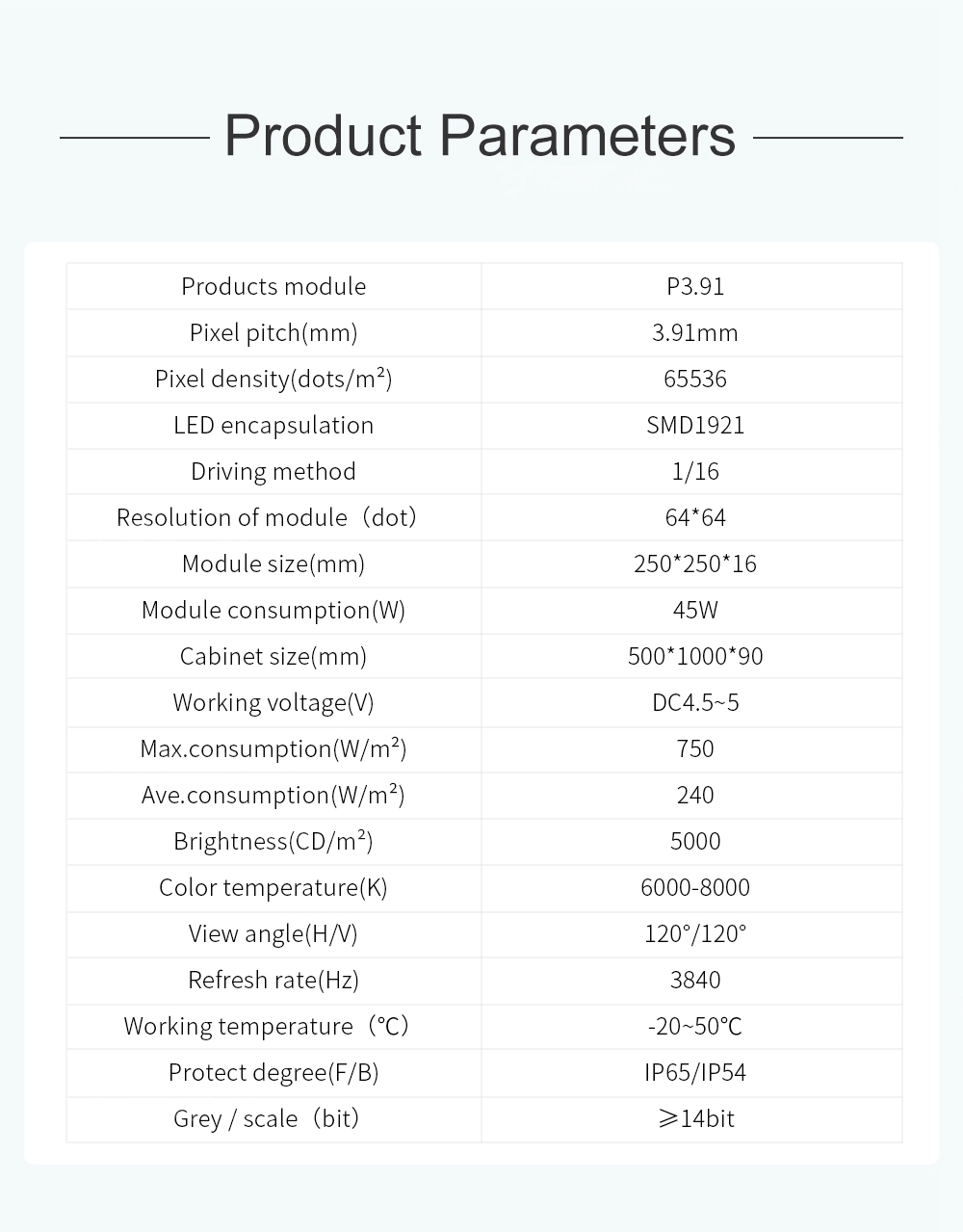 Características del módulo : 1, Fácil: Diseño modular, fácil montaje y mantenimiento. 2, tamaño del módulo: 250*250 mm, superficie lisa, espacio entre módulos pequeño, alta precisión Características del gabinete : ● Ligero: Tamaño del gabinete: 500*500*86 mm, Peso: 8,5 kg/pieza. ● Delgado: Diseño de aluminio fundido a presión, alta precisión, espesor de solo 86 mm. ● Rápido: Cerraduras rápidas, fácil de montar y desmontar. ● Compatibilidad: Tamaño de píxel disponible para P2.6, P3, P3.91, P4, P5, P6. ● Bajo: Excelente diseño de refrigeración, no se necesitan ventiladores ni aires acondicionados. Silencioso, bajo consumo de energía y rentable.
