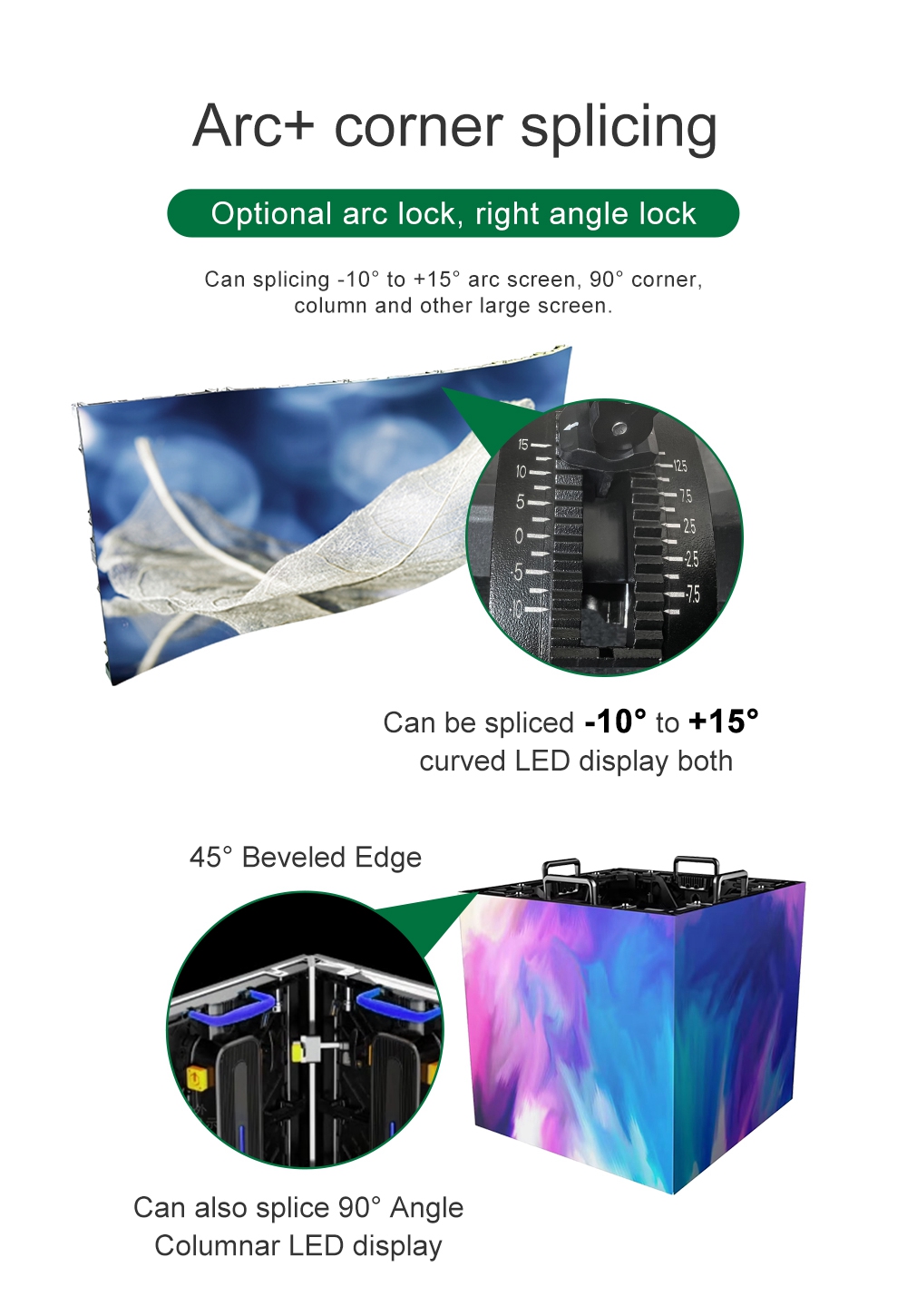* Adaptable a múltiples escenarios: Compatible con gabinetes de 500 x 500 mm y 1000 mm, lo que permite instalaciones mixtas. La versión curva admite configuraciones para pantallas con arcos de -10° a 15°, esquinas de 90° e instalaciones en columna para pantallas grandes.
