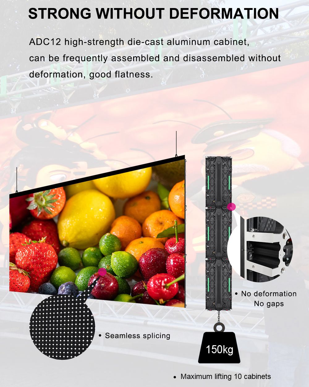 Características: 1 Buena planitud: la pantalla adopta gabinetes de aluminio fundido a presión con una tolerancia de 0,1 mm; 2 Ultradelgado: los gabinetes de aluminio fundido a presión son un 20 % más delgados y pesan 15 kg/㎡ que los gabinetes de hierro, lo que ayuda a reducir significativamente los costos de transporte y estructura; 3 Fácil de actualizar y reemplazar: los gabinetes se adaptan a nuestros módulos P2.5~P16; para que no tenga que cambiar los gabinetes para una actualización, esto ahorrará una gran cantidad de mano de obra y costos de gabinete; 4 Múltiples propósitos: como solución de visualización de gran tamaño, la serie C-Fit se utiliza ampliamente como pantallas de publicidad exterior, pantallas de alquiler de escenarios y pantallas LED perimetrales de estadios; la serie C-Fit no solo se utiliza como pantallas montadas permanentemente en la pared, sino también como pantallas apiladas en el suelo para eventos pequeños o espacios con techos bajos; 5 Alto brillo: el brillo alcanza 3700~4200CD/㎡, por lo que la pantalla aún puede presentar imágenes claras bajo una luz intensa; 6 Aumento lento de la temperatura, disipación de calor eficiente: el dispositivo de disipación de calor adopta un material de aleación de aluminio y magnesio con excelente conducción del calor; 7 Altamente rentable: una carcasa con clasificación IP65 brinda protección contra todo tipo de condiciones climáticas adversas, como chorros de agua, niebla salina, corrosión salina y erosión eólica; 8 Alta confiabilidad: todos los módulos adoptan técnica de sellado y alambre de cobre de alta calidad;