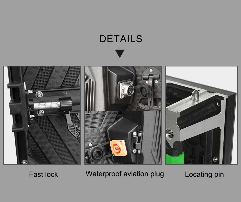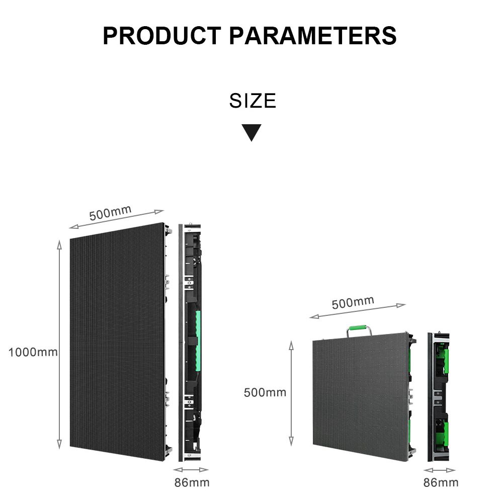 Características del módulo : 1, Fácil: Diseño modular, fácil montaje y mantenimiento. 2, tamaño del módulo: 250*250 mm, superficie lisa, espacio entre módulos pequeño, alta precisión Características del gabinete : ● Ligero: Tamaño del gabinete: 500*500*86 mm, Peso: 8,5 kg/pieza. ● Delgado: Diseño de aluminio fundido a presión, alta precisión, espesor de solo 86 mm. ● Rápido: Cerraduras rápidas, fácil de montar y desmontar. ● Compatibilidad: Tamaño de píxel disponible para P2.6, P3, P3.91, P4, P5, P6. ● Bajo: Excelente diseño de refrigeración, no se necesitan ventiladores ni aires acondicionados. Silencioso, bajo consumo de energía y rentable.