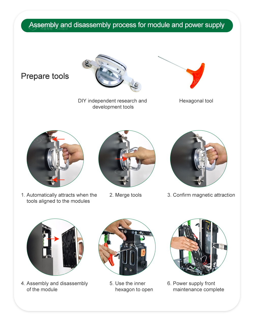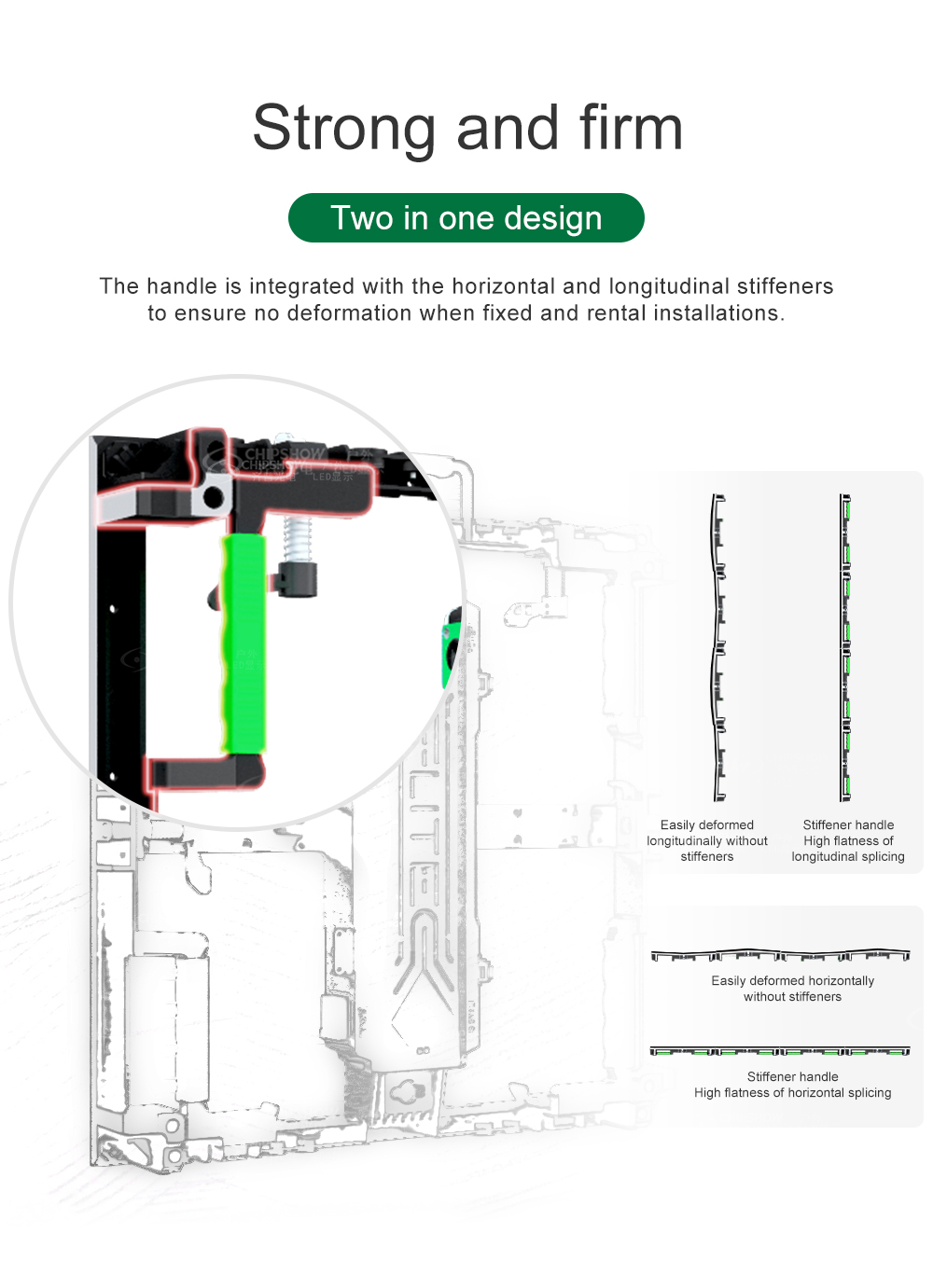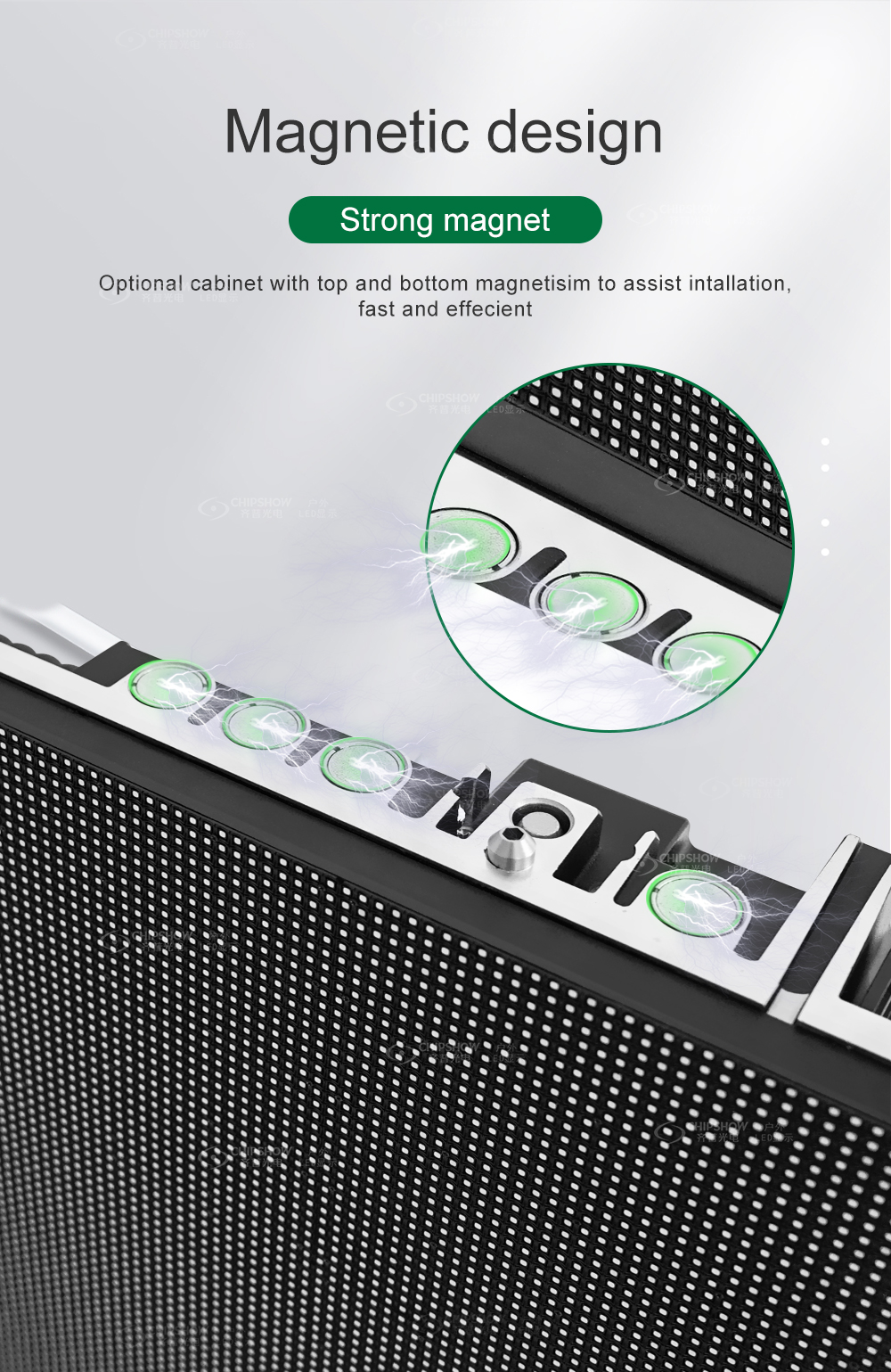 3. Diseño magnético: el módulo magnético se puede mantener desde la parte delantera y trasera; El imán entre los gabinetes se coloca e instala con precisión y es muy rentable para la instalación de alquiler.