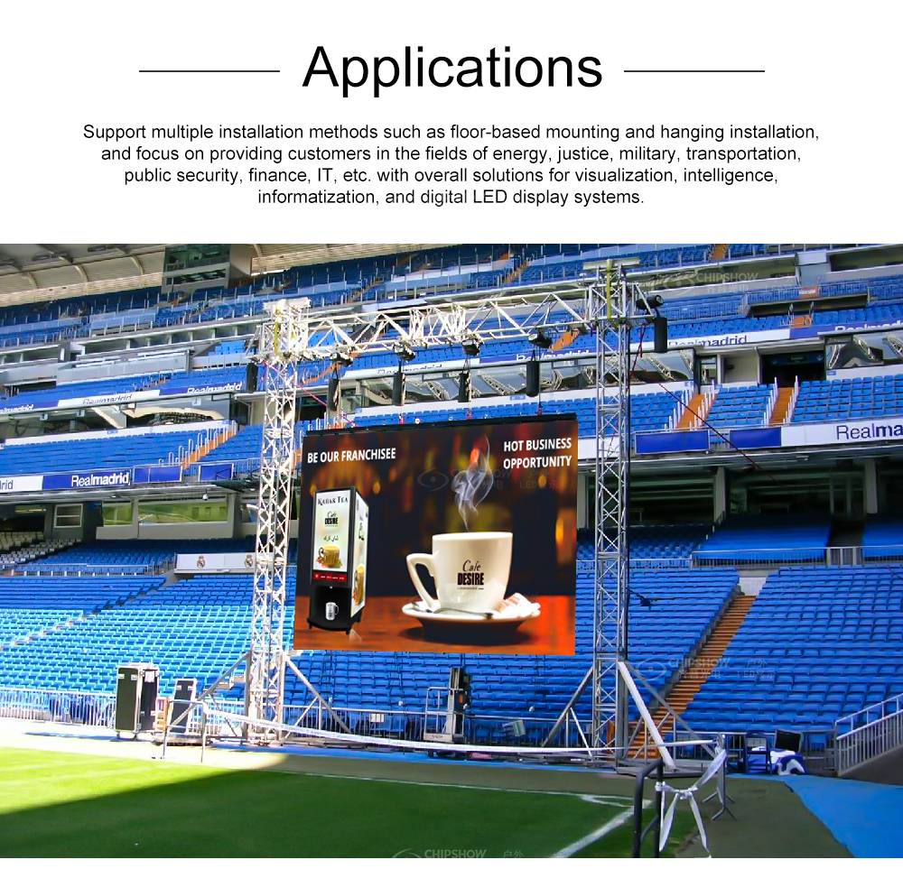 7. Aplicaciones múltiples: admite múltiples métodos de instalación, como montaje en el piso e instalación colgante, y se enfoca en brindar a los clientes en los campos de energía, justicia, ejército, transporte, seguridad pública, finanzas, TI, etc. soluciones generales para visualización. , inteligencia, informatización y sistemas de visualización LED digitales.