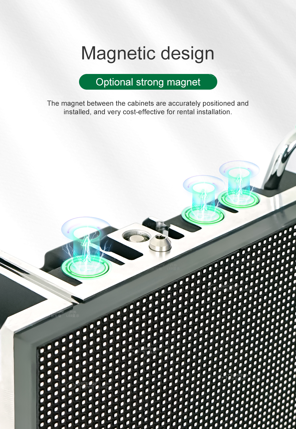 4 Diseño magnético (opcional): puede optar por utilizar los imanes superiores e inferiores entre los gabinetes para posicionarlos e instalarlos rápidamente; desde el punto de instalación para servicios de alquiler, este tipo de pantalla LED es muy rentable;