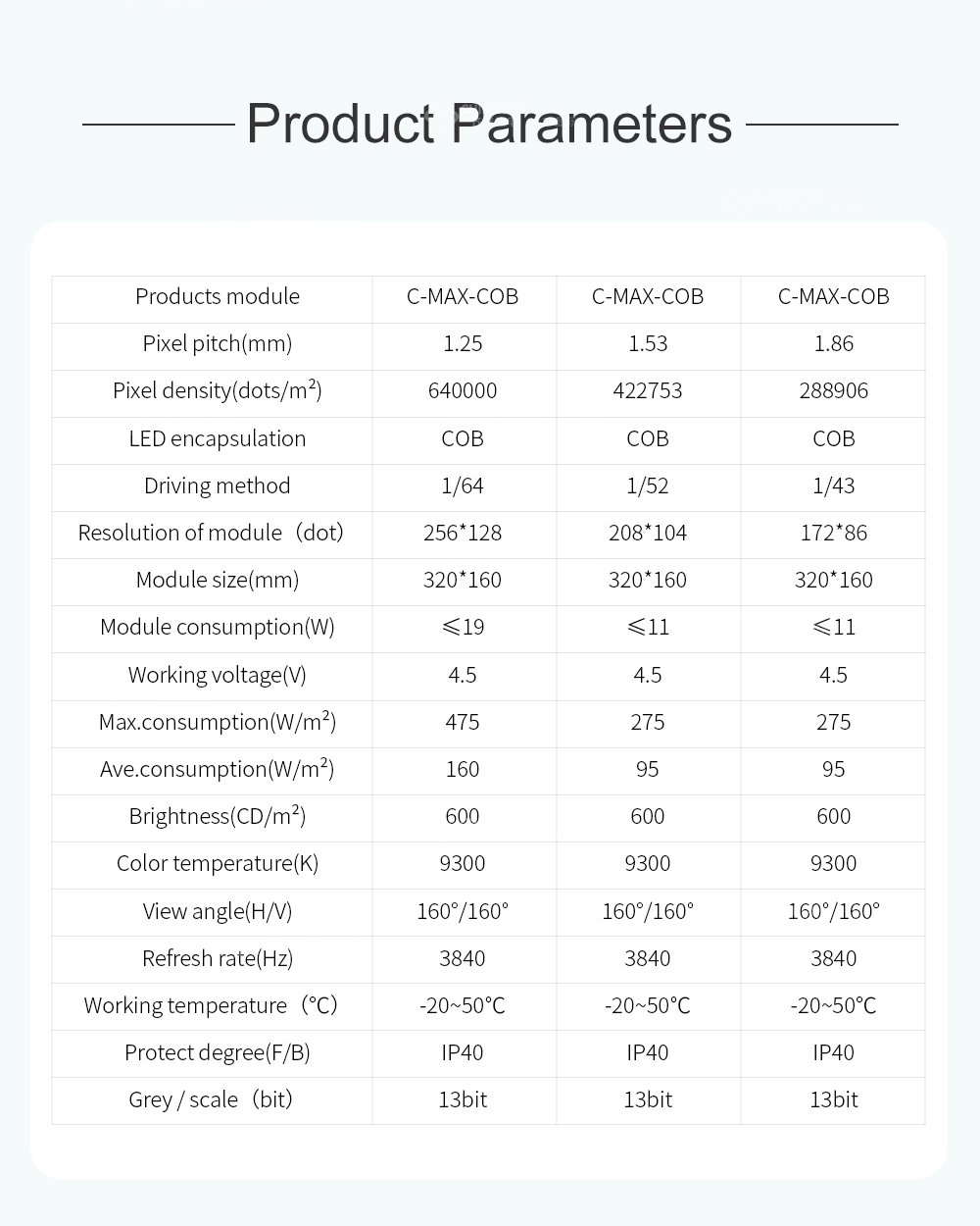 3 Buena compatibilidad: los pasos de píxeles de la serie C-Max COB están disponibles en 1,25 mm, 1,53 mm y 1,86 mm; los gabinetes pueden ser compatibles con nuestros módulos de la serie C-Max (P1.2/1.3/1.5/1.6/1.8/2/2.5/3/3.3/4); por lo que cuando se trata de una mayor actualización de la solución para obtener imágenes de mayor calidad, puede ahorrarle un costo considerable en gabinetes;