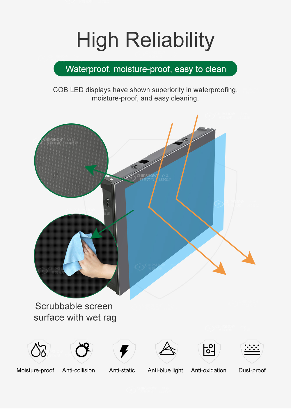 1 Alta confiabilidad: las pantallas LED de la serie C-Max COB son resistentes al agua, a la humedad y fáciles de limpiar;