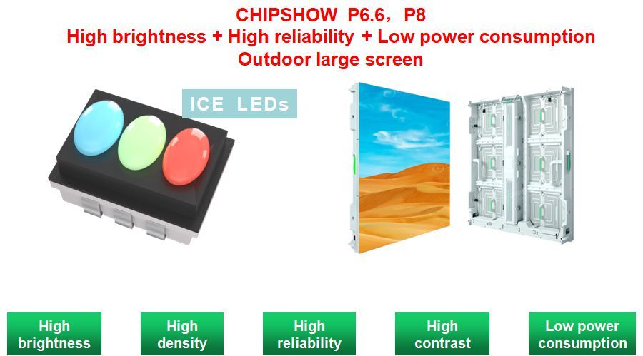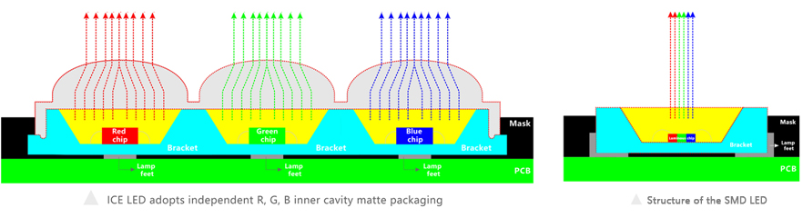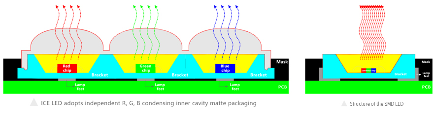 En comparación con los LED SMD, los módulos rojo, verde y azul del LED ICE están encapsulados de forma independiente, lo que contribuye a una disipación del calor más rápida;