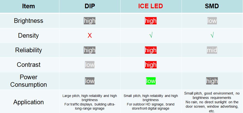 Veamos la comparación completa entre LED DIP, LED SMD y nuestro LED ICE: