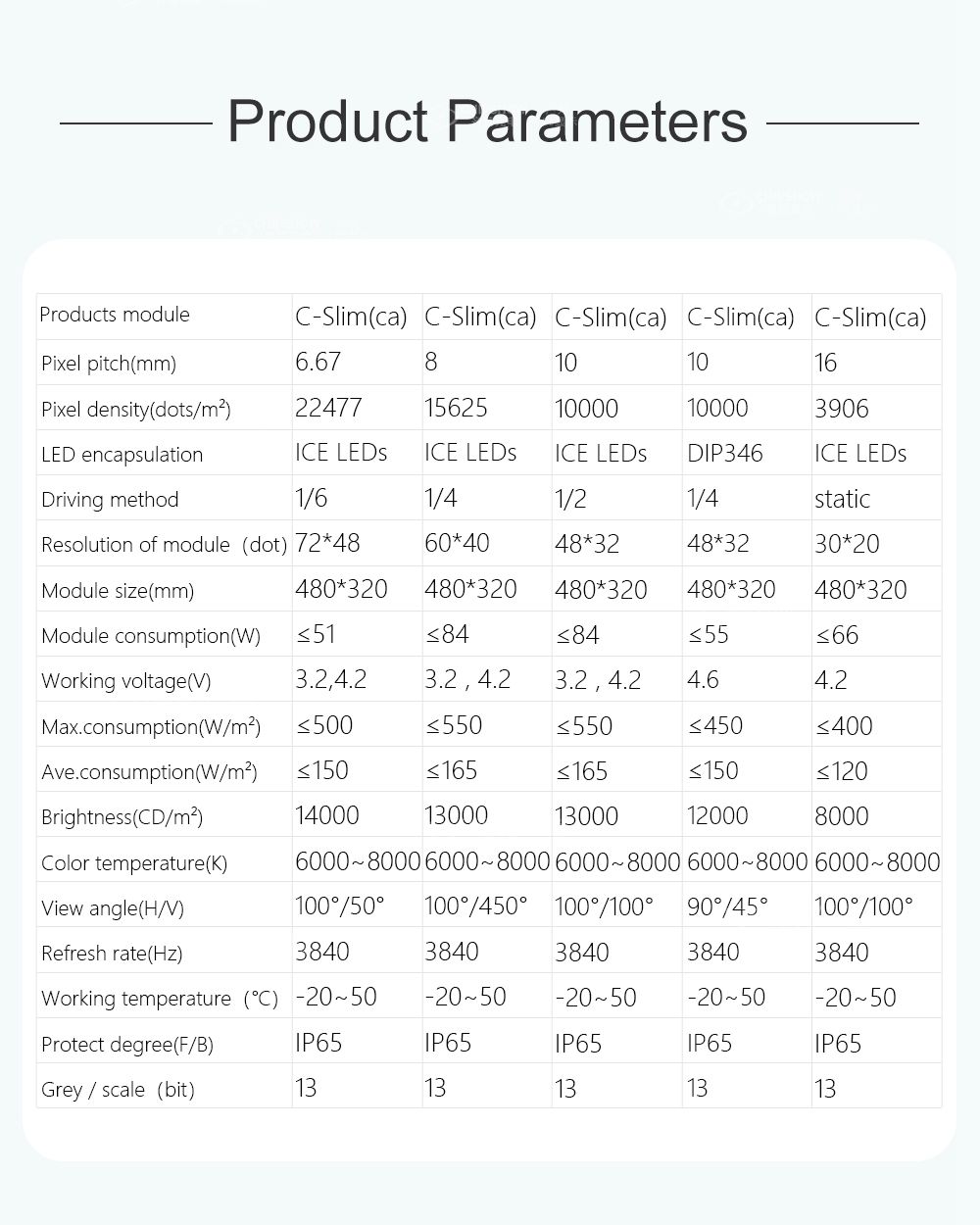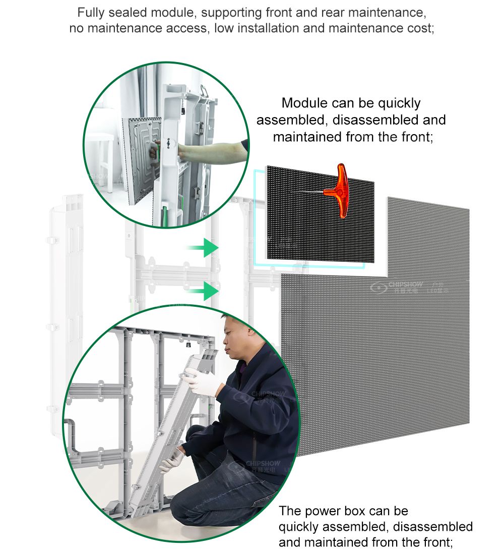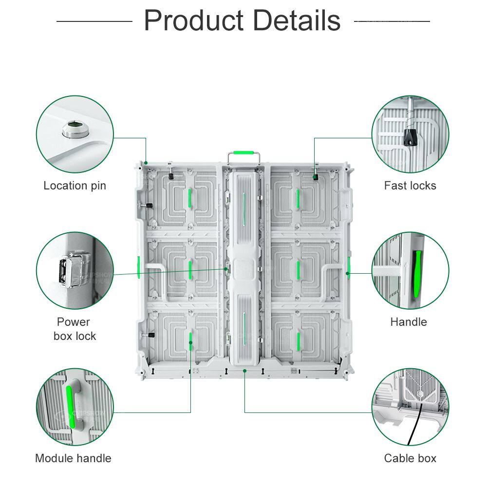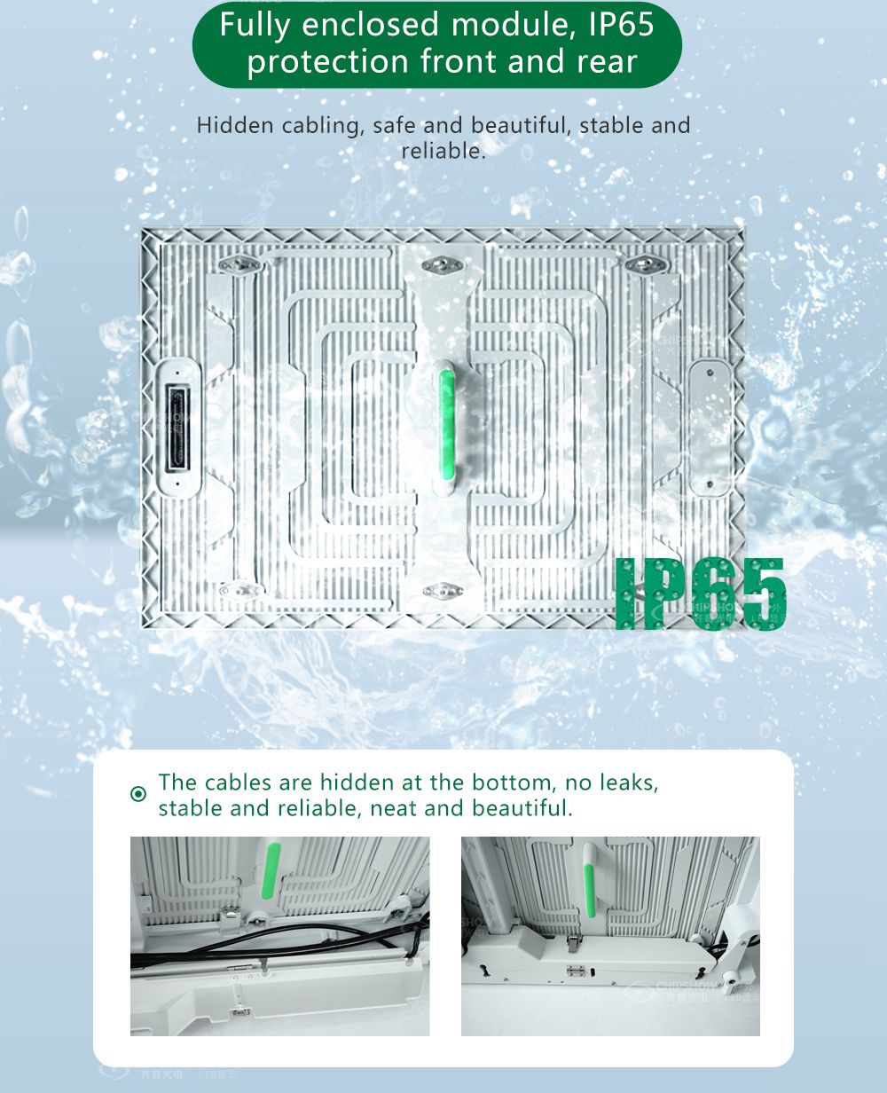 Los módulos LED están completamente cerrados, y tanto la parte delantera como la trasera de los módulos alcanzan el grado de impermeabilidad IP65; además, los cables están ocultos y escondidos en la parte inferior de la pantalla; esto no solo muestra una apariencia diminuta sino que también garantiza un uso seguro y confiable.