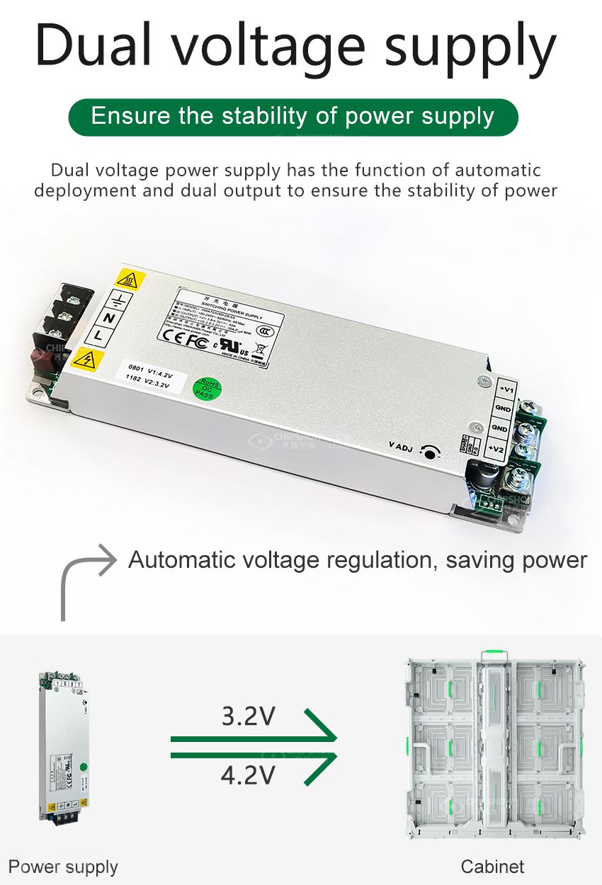 5 El sistema de suministro de energía dual puede producir y ajustar automáticamente dos voltajes de salida diferentes; por lo tanto, las pantallas siempre funcionan con una calidad de suministro de energía altamente estable;