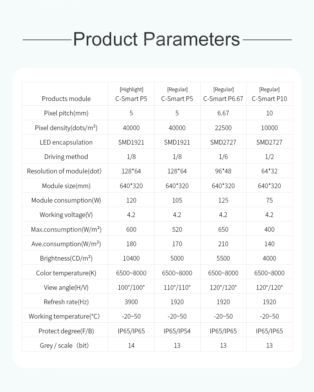 7 Protección de alto nivel: los módulos completamente cerrados con clasificación IP65 garantizan que las pantallas puedan adaptarse a diversas condiciones exteriores;