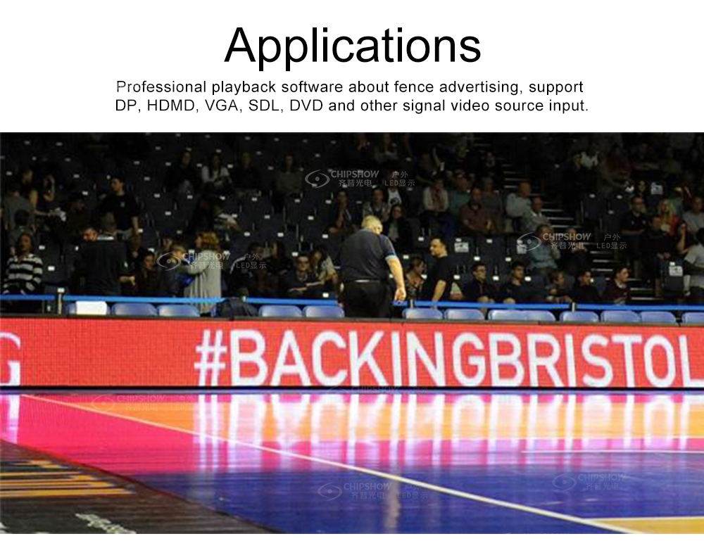 Las pantallas LED P8,P10 C-Fit-Sport adoptan tecnología de reemplazo virtual. Los anuncios virtuales podrían transmitirse a diferentes países en lugar de los anuncios reales en los estadios. Ventajas: 1. Pantalla LED perimetral inteligente. 2. Tecnología de reemplazo virtual, alimentada por LED IR. 3. Diseño de gabinete de rápida instalación y mantenimiento. 4. Diseño de kit de protección suave para proteger a los jugadores de daños. 5. El sistema de disipación de calor de presión negativa garantiza aún más la confiabilidad. 6. Disponible para monitoreo remoto mediante aplicación .