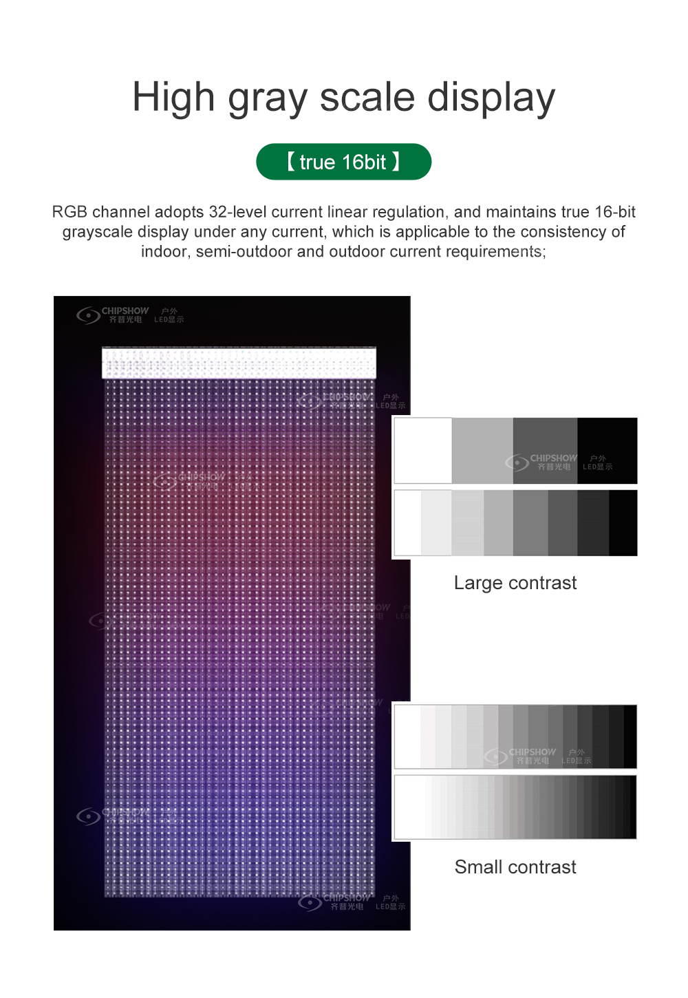 3 Escala de grises alta: el canal RGB adopta la regulación lineal (nivel de corriente de 32 niveles) para mostrar la imagen en escala de grises de 16 bits bajo cualquier corriente; por lo que no tiene que preocuparse por el requisito de entrada de corriente, ya sea en circunstancias interiores o semiexteriores;
