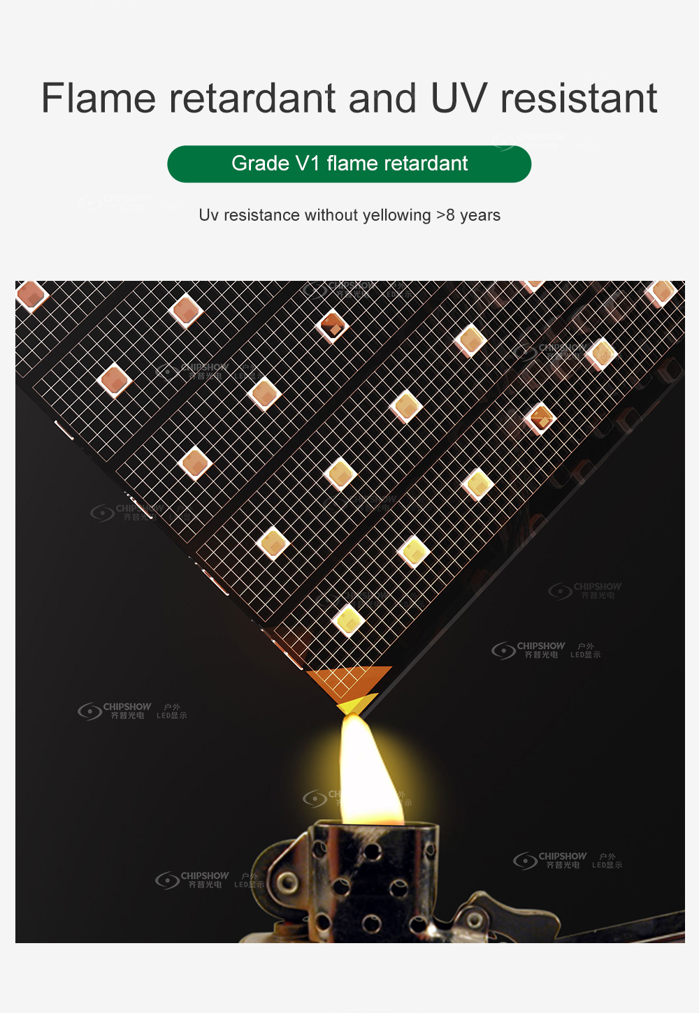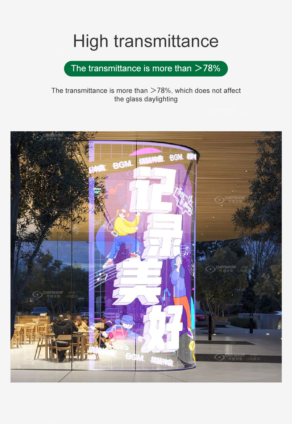 Pantalla publicitaria profesional para pared de vidrio transparente interior: 1: Ultraligero y ultradelgado: el peso del gabinete de aluminio es inferior a 5 kg/m² y el gabinete tiene buena resistencia a la deformación y extensión; cada gabinete es muy liso y se puede unir sin problemas; esto facilita el montaje de la pantalla LED de malla transparente en una pared de vidrio; 2: Alta transparencia: la tasa de transparencia alcanza más del 40%; cuando se muestra la pantalla, las imágenes parecen aparecer en el aire; 3: Color de fondo personalizable: el color de fondo de la pantalla se puede personalizar de acuerdo con requisitos específicos (por ejemplo, si el color de la pared es negro, el color de fondo de la pantalla se puede configurar en negro); durante el día, la pantalla de malla transparente no cambia el estilo original del edificio cuando no funciona; 4: Fácil de instalar y mantener: la pantalla de malla transparente se puede instalar y desmontar desde el frente, y todos los conectores adoptan enchufes de aviación de calidad profesional; la eficiencia de instalación y mantenimiento es alta; mientras tanto, el costo de instalación y mantenimiento es bajo; 5: Sin parpadeos ni imágenes fantasma: la luz y la sombra son suaves y naturales; la pantalla de malla funciona con una alta velocidad de fotogramas y una salida sin pérdidas en escala de grises de 16 bits; 6: Silencioso y ahorra energía: adopta un diseño silencioso sin ventilador y un sistema de ventilación autónomo para disipar el calor de manera efectiva; en comparación con las pantallas de malla transparente comunes en el mercado, la serie Chipshow C-Mesh puede ahorrar casi un 30% del costo que debería haberse utilizado en la disipación de calor; 7: Las pantallas de malla transparente C-Mesh se utilizan ampliamente en una variedad de locales comerciales interiores, como centros comerciales, hoteles, lugares turísticos, cercas alrededor de propiedades comerciales, salas de exposiciones, tiendas minoristas y puentes cubiertos de vidrio;