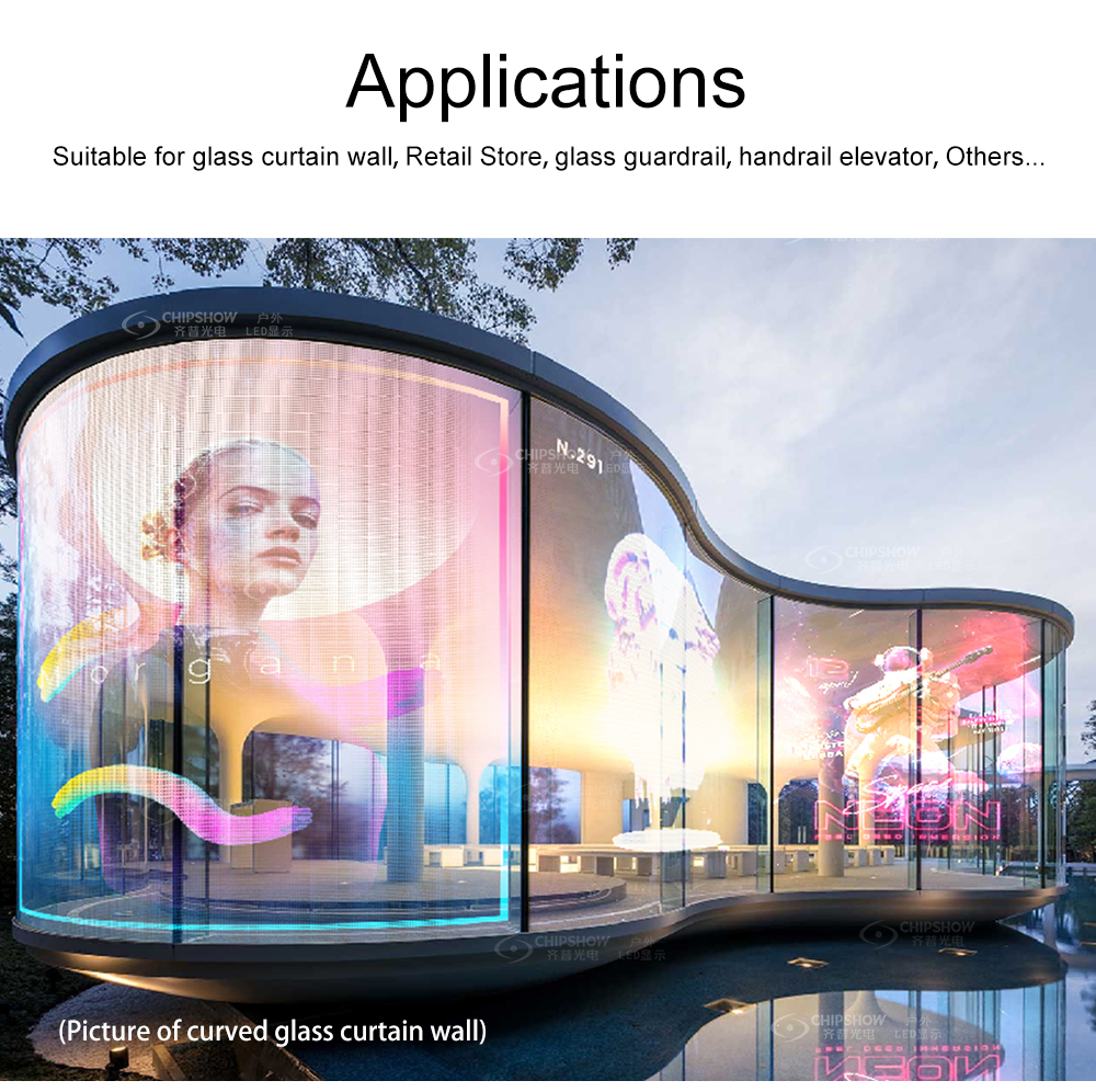 7 Amplia aplicación: la pantalla de película LED es muy común en puntos de venta comerciales interiores y se usa ampliamente para publicidad en medios transparentes, como muros cortina de vidrio, paredes acrílicas, barandillas de vidrio...
