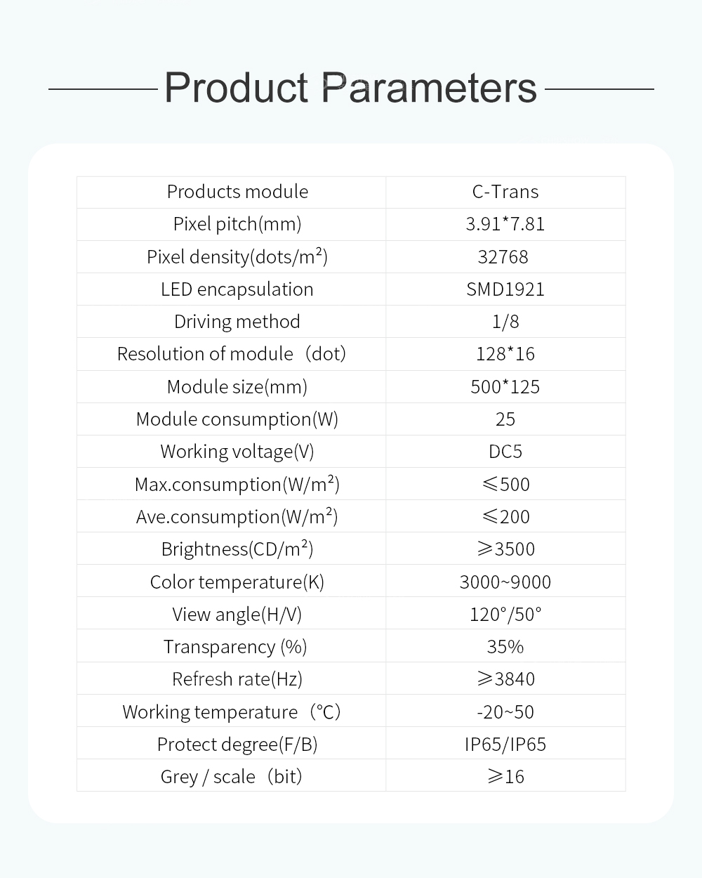 Pantalla LED transparente para exteriores C-Trans P5.35Si está interesado en nuestros productos y desea conocer más detalles, deje un mensaje aquí, le responderemos lo antes posible.