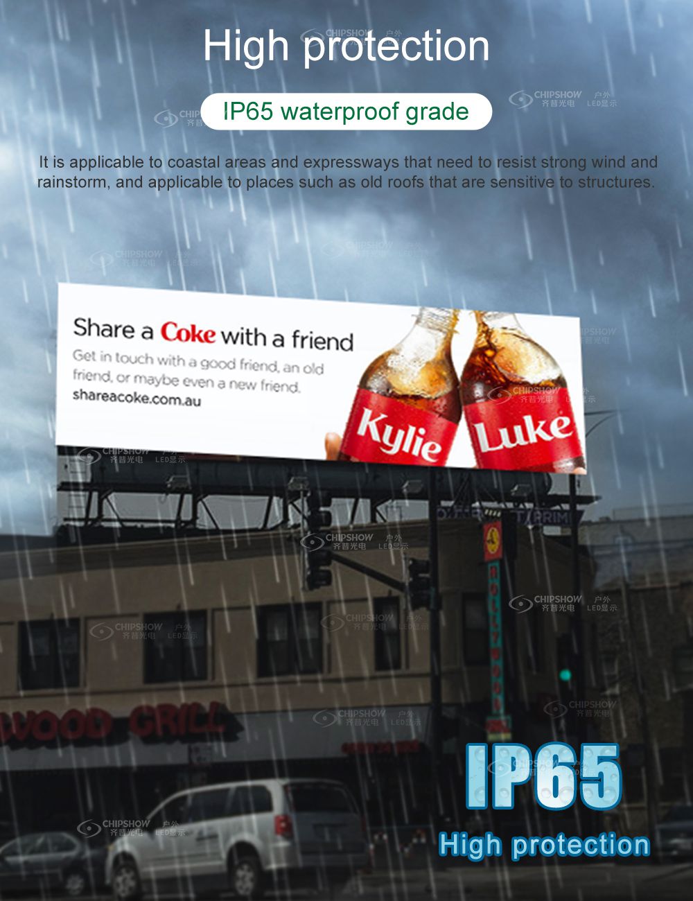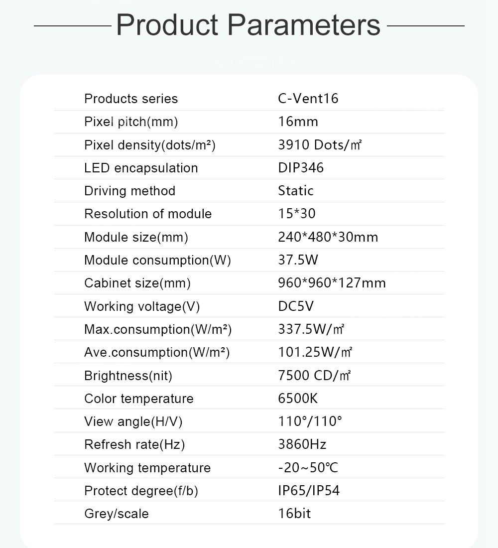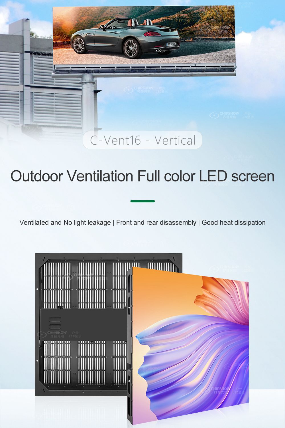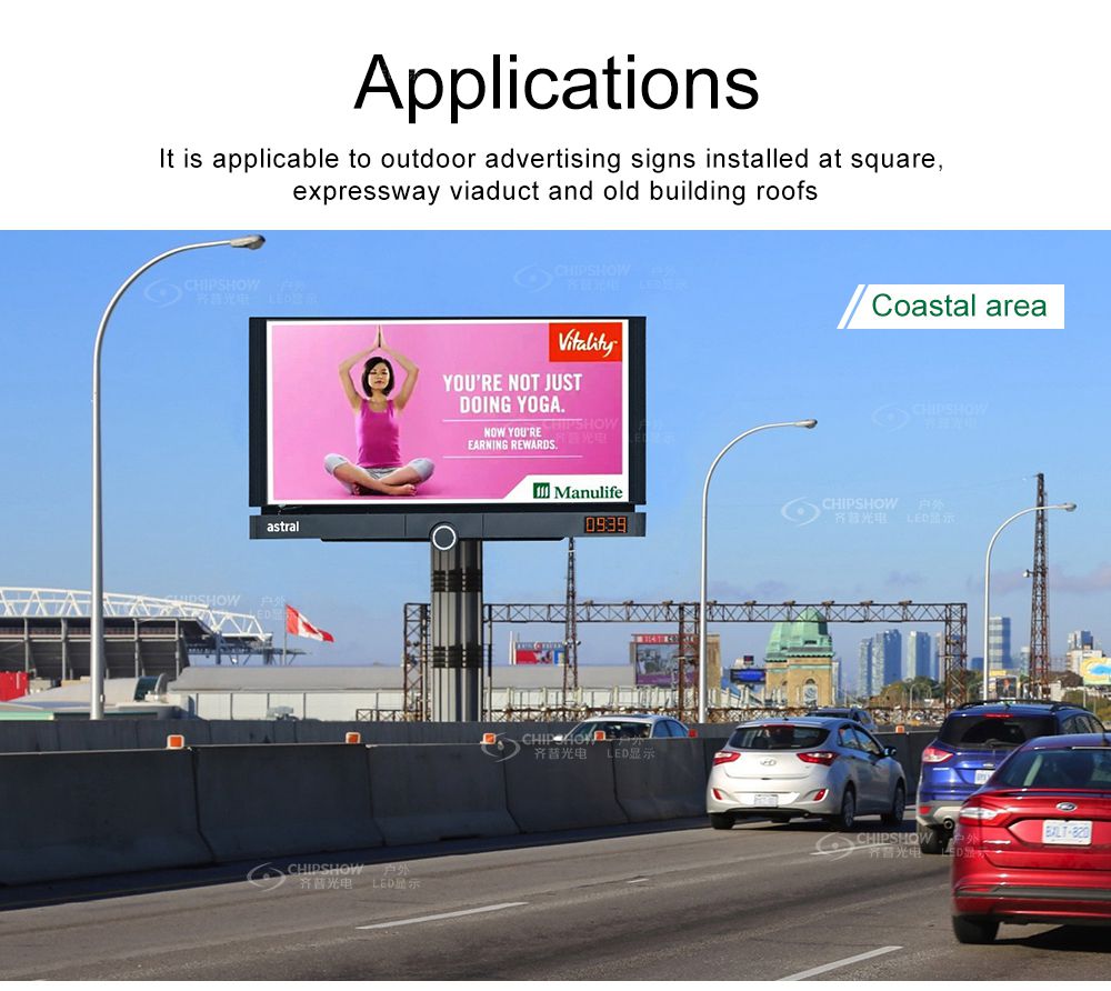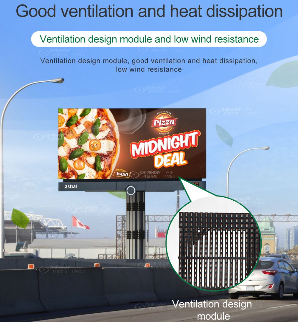 Esta pantalla es ventilada, liviana, delgada y con mantenimiento frontal disponible, lo cual es adecuada para soluciones de publicidad en paredes exteriores, especialmente para soluciones de publicidad unipolar para exteriores.
