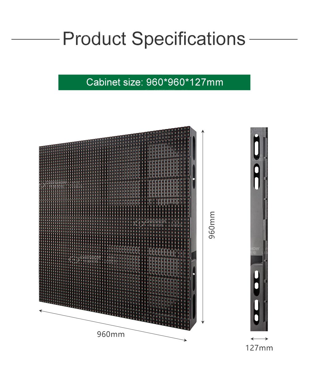 3 Las pantallas de visualización se caracterizan por su diseño “Hollow Out” y su peso ligero (peso del gabinete (tamaño: 960*960 mm): 33 kg, espesor del gabinete (incluidos los módulos): 127 mm);