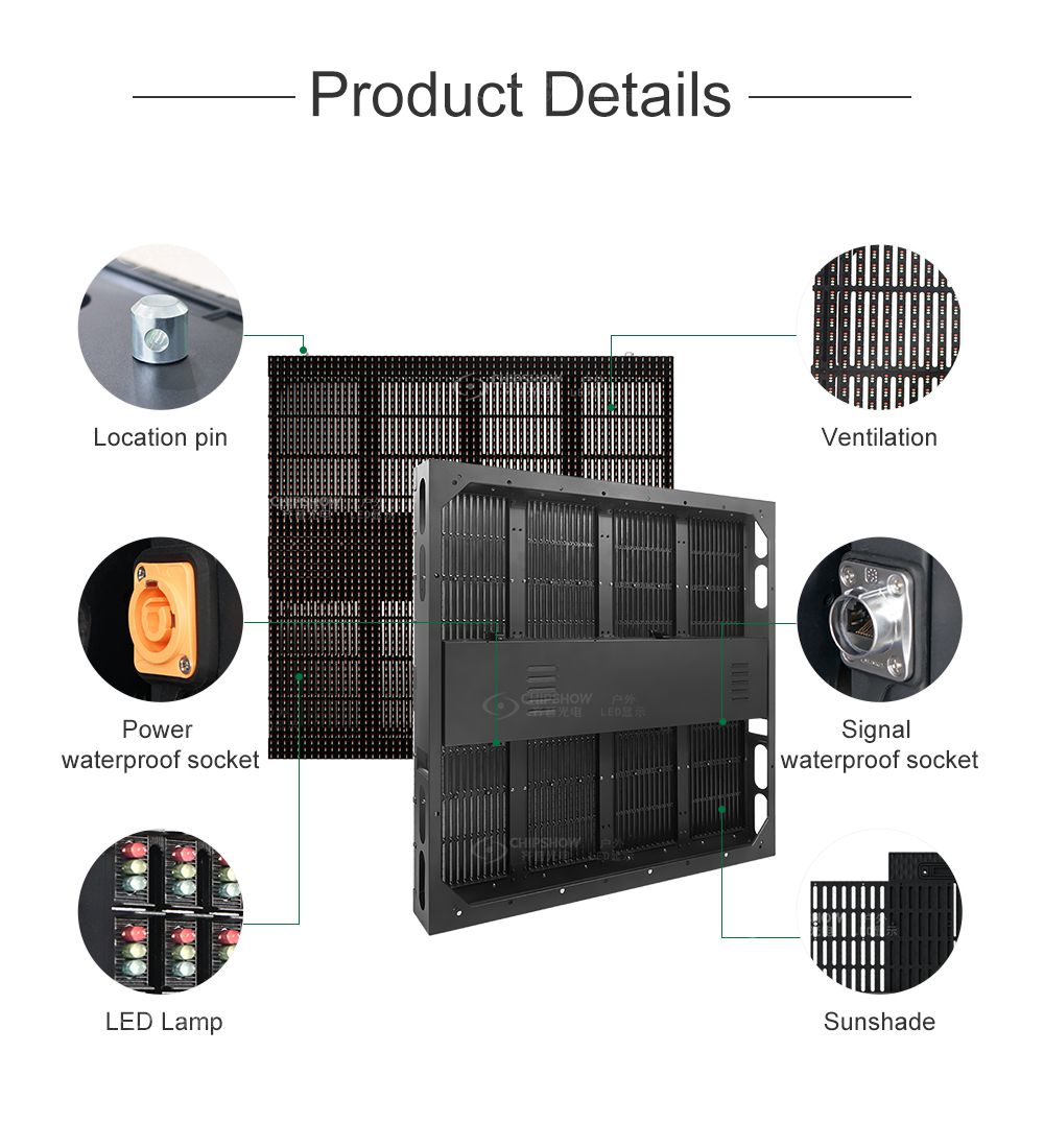 Características: 1 Buena planitud: la pantalla adopta gabinetes de aluminio fundido a presión con una tolerancia de 0,1 mm; 2 Ultradelgado: los gabinetes de aluminio fundido a presión son un 20 % más delgados y pesan 15 kg/㎡ que los gabinetes de hierro, lo que ayuda a reducir significativamente los costos de transporte y estructura; 3 Fácil de actualizar y reemplazar: los gabinetes se adaptan a nuestros módulos P2.5~P16; para que no tenga que cambiar los gabinetes para una actualización, esto ahorrará una gran cantidad de mano de obra y costos de gabinete; 4 Múltiples propósitos: como solución de visualización de gran tamaño, la serie C-Fit se utiliza ampliamente como pantallas de publicidad exterior, pantallas de alquiler de escenarios y pantallas LED perimetrales de estadios; la serie C-Fit no solo se utiliza como pantallas montadas permanentemente en la pared, sino también como pantallas apiladas en el suelo para eventos pequeños o espacios con techos bajos; 5 Alto brillo: el brillo alcanza 3700~4200CD/㎡, por lo que la pantalla aún puede presentar imágenes claras bajo una luz intensa; 6 Aumento lento de la temperatura, disipación de calor eficiente: el dispositivo de disipación de calor adopta un material de aleación de aluminio y magnesio con excelente conducción del calor; 7 Altamente rentable: una carcasa con clasificación IP65 brinda protección contra todo tipo de condiciones climáticas adversas, como chorros de agua, niebla salina, corrosión salina y erosión eólica; 8 Alta confiabilidad: todos los módulos adoptan técnica de sellado y alambre de cobre de alta calidad;