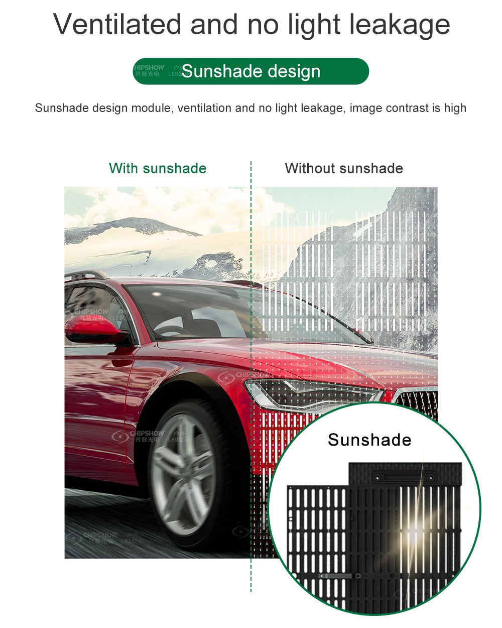 4 Basado en el diseño de la caja de señales y las unidades de suministro de energía integradas, las estructuras internas de las pantallas son relativamente simples, y las pantallas de la serie C-Vent simplemente recurren a la convección de aire dentro de las pantallas para disipar el calor sin usar aires acondicionados; por tanto, se puede ahorrar más energía;