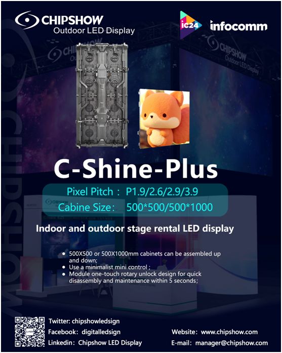 Chipshow actualizó recientemente C-Shine-Plus (pantalla LED de alquiler de escenarios para interiores y exteriores). Chipshow ha incluido las características más demandadas como alto brillo, buen efecto de visualización, ahorro de energía, peso ligero, mantenimiento simplificado y una calidad de imagen sorprendente.