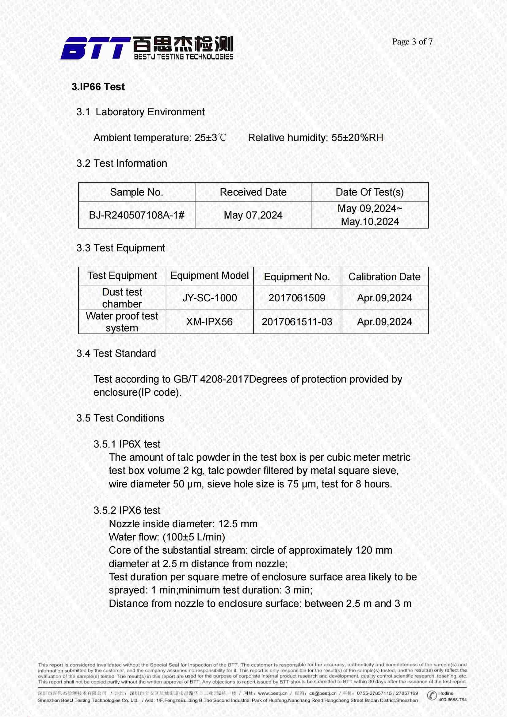 (Informe de prueba n.° BJ-R240507108A-EN), que valida su resiliencia en entornos exteriores hostiles. Realizada en mayo de 2024, esta certificación confirma el cumplimiento de