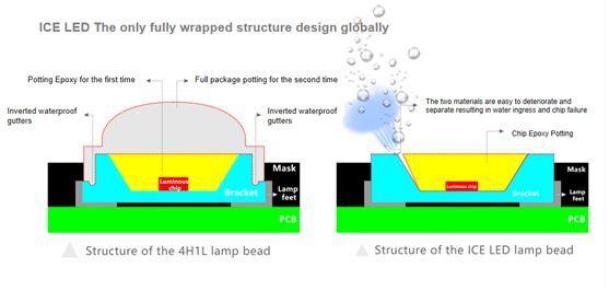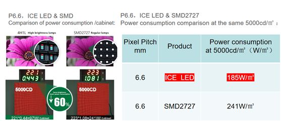 La potencia de la pantalla de la lámpara ICE se reduce significativamente en comparación con las perlas de lámpara de montaje en superficie comunes, como las perlas de lámpara 2727 con el mismo espacio.