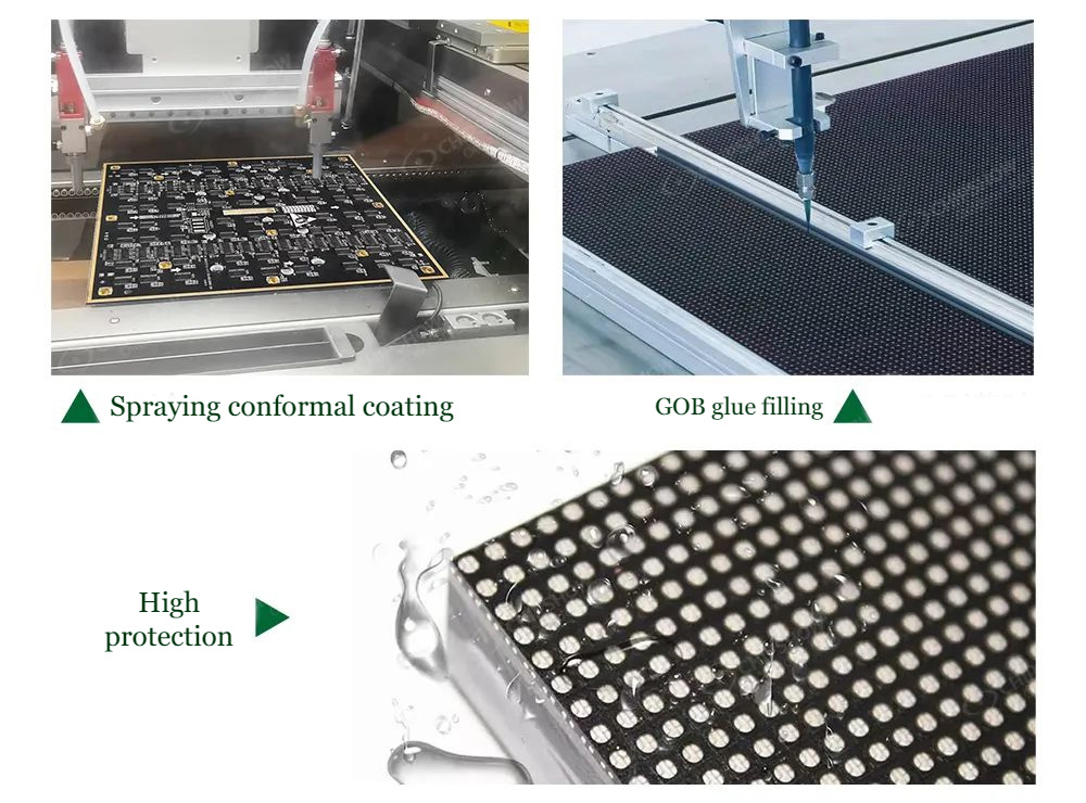 1. C-Lite-Plus P1.56, como pantalla exterior, debe tener fuertes capacidades de protección. Chipshow roció pintura conformal en sus módulos y agregó anillos de goma impermeables. El frente de los módulos tiene GOB y tratamiento de vertido de pegamento para una protección múltiple. La artesanía mejora en gran medida la resistencia al agua y la estanqueidad al aire de C-Lite-Plus, y se puede usar de manera estable en exteriores.